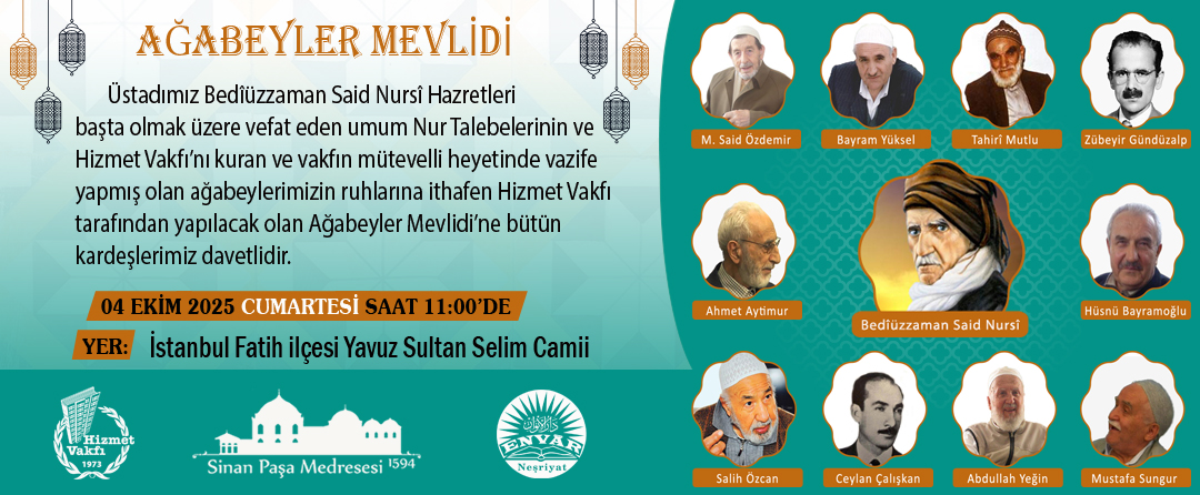 İnna lillahi ve inna ileyhi raciun. 18-04-2021 Saat 22:30 itibariyle Üstadımız Hz. Bedîüzzaman’ın son varisi Hüsnü Bayramoğlu Ağabey Hakk’ın rahmetine vasıl olmuştur. Hüsnü Bayramoğlu Ağabeyimizin Cenaze Programı: 20 Nisan Salı günü Öğle Namazını Müteakip Eyüp Sultan Camiinde cenaze namazı kılınacak ve Eyüp Sultan Kabristanında defnedilecektir.